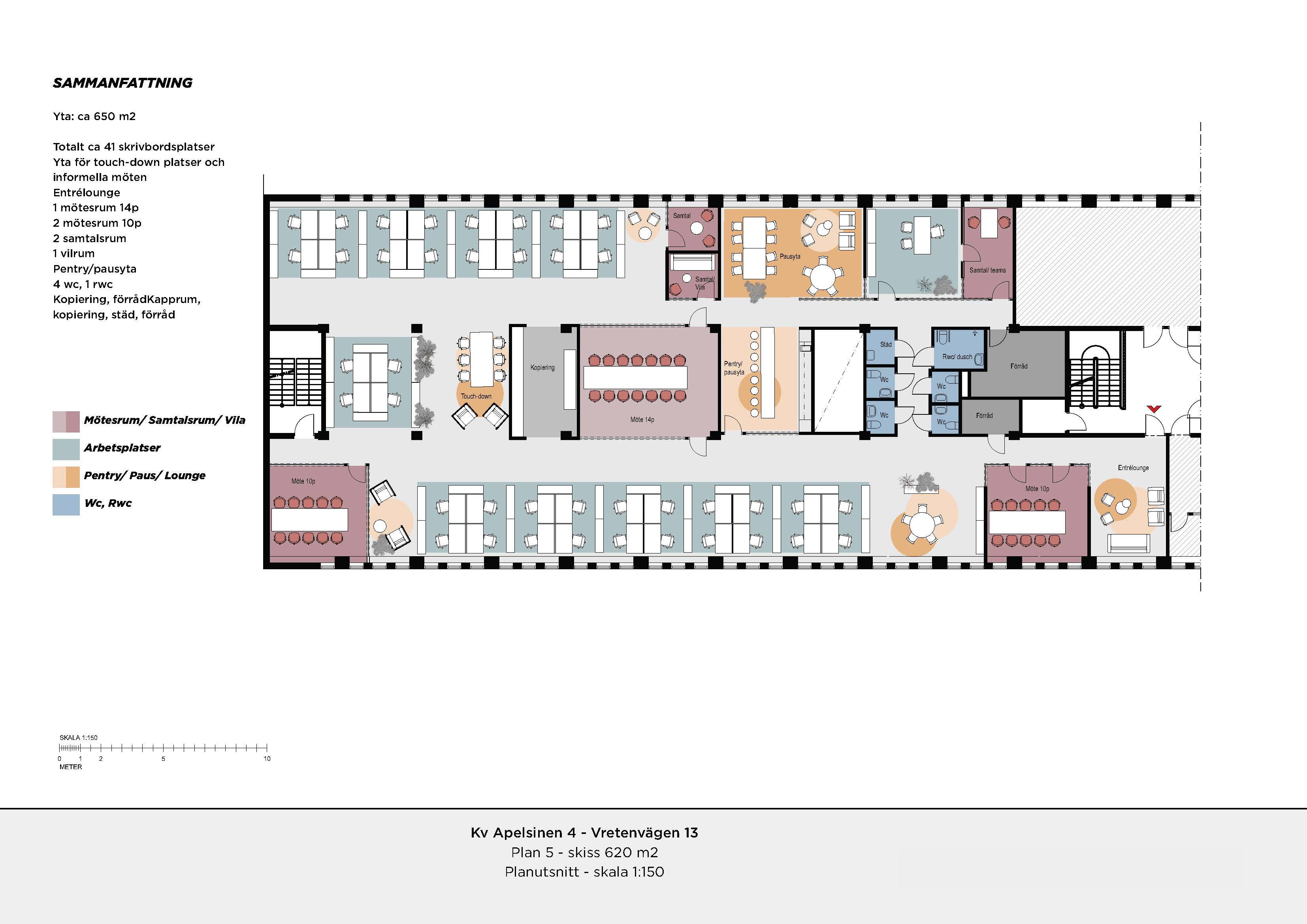 Den öppna planlösningen ger plats för ca 41 skrivbordsplatser. Här finns en kombination av små och stora mötesrum samt öppna lounger och touch downs för spontana pauser med kollegorna. Lokalens hjärta är det generösa pentryt med gott om sittplatser, där framtidens luncher och AWs kan äga rum.