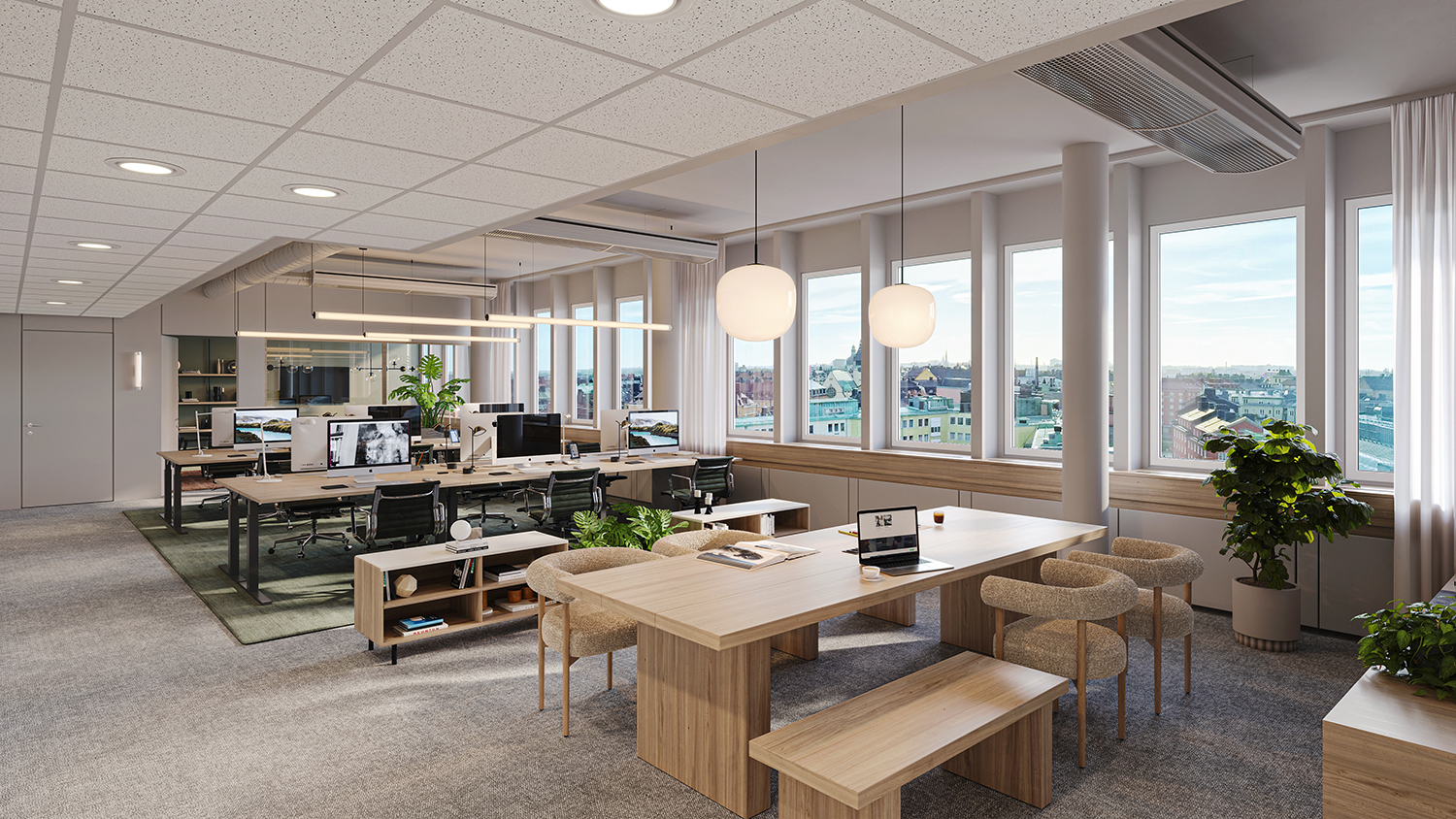 Hyr våning 6 och 7 och skapa ett drömkontor om 2 860 kvm med plats för cirka 315 personer. En generös interntrappa binder samman de två planen till en naturlig helhet. Planlösningen kombinerar öppna ytor med fasta och flexibla arbetsplatser, stängda kontorsrum samt mötesrum i olika storlekar. Här finns också gott om pausytor för gemenskap och spontana samtal. Kontorets hjärta finns på plan 6, ett öppet pentry med köksö och lounge.