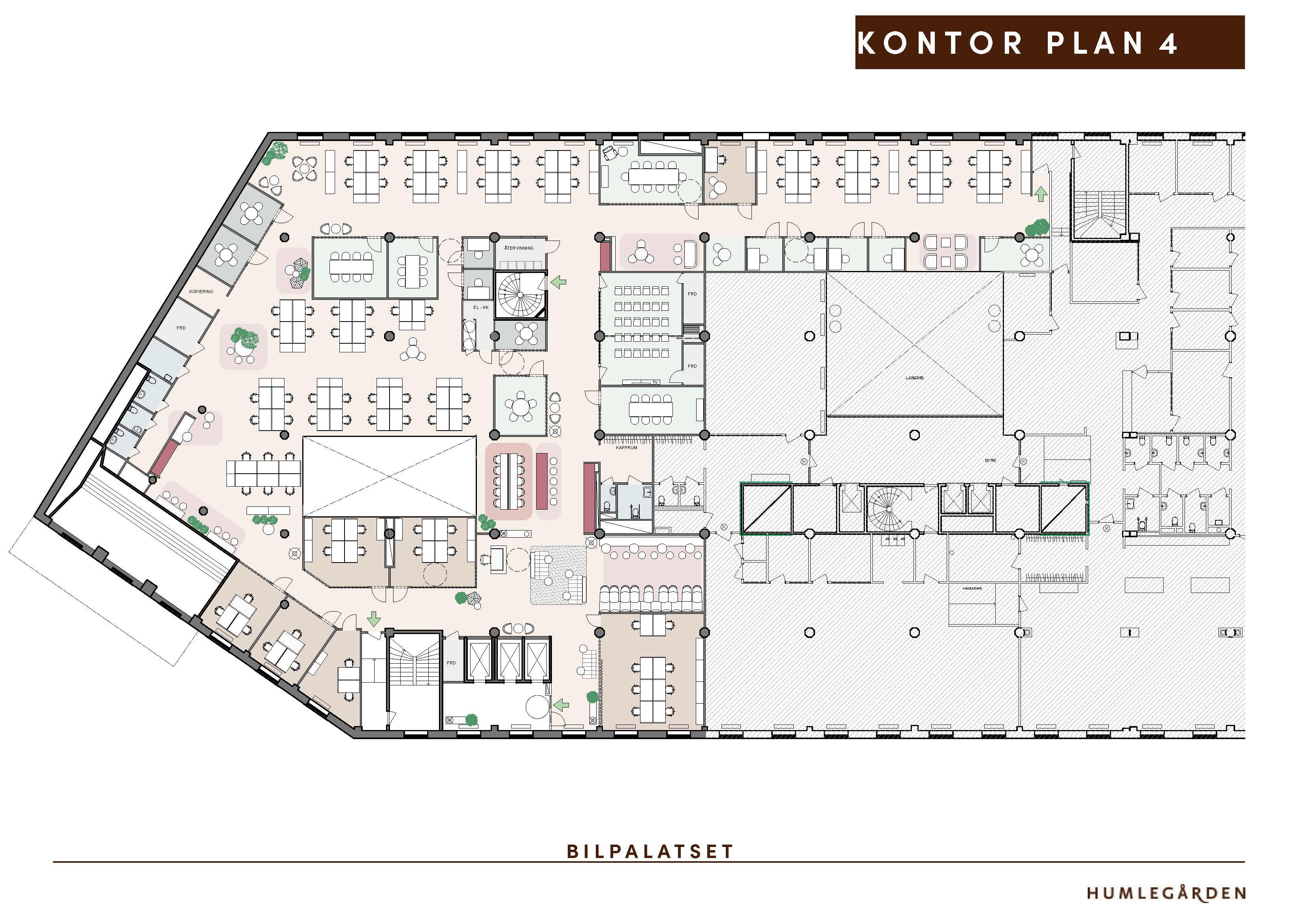 På plan 4 i Bilpalatset erbjuds 1 200 kvm med luftig atmosfär och fönster i tre väderstreck. Lokalen kombinerar ett öppet kontorslandskap med mer avskilda kontorsrum för fokus och arbetsro. Teamsrum, mötesrum i olika storlekar samt ett generöst konferensrum ger goda förutsättningar för såväl spontana avstämningar som större presentationer. Planlösningen är flexibel var med och utforma lokalen efter er verksamhets behov.