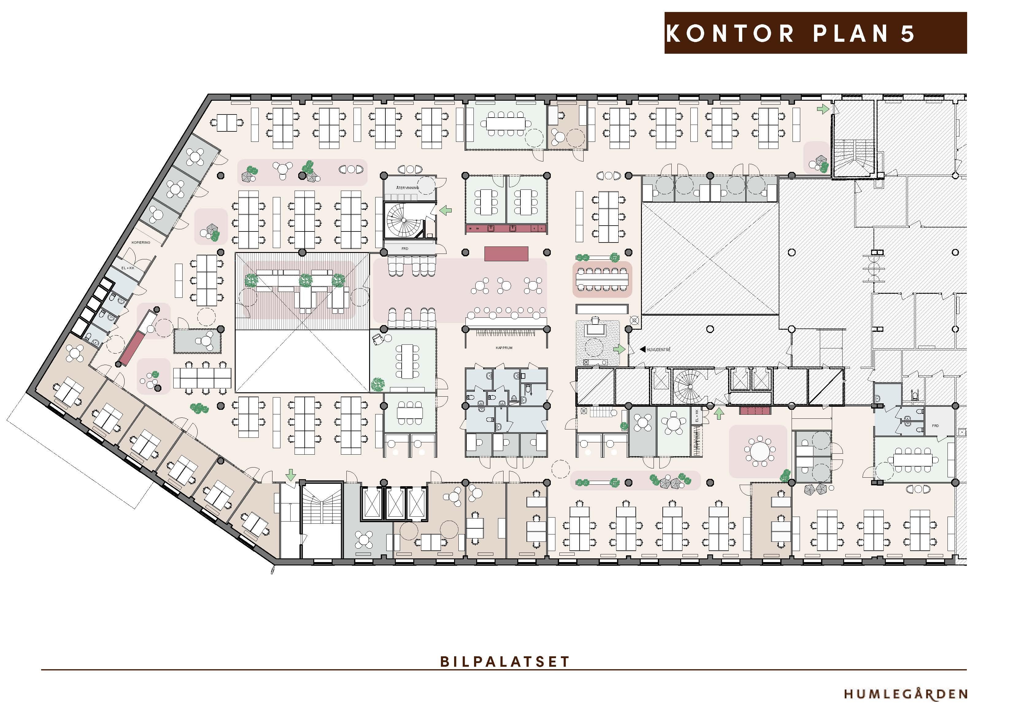 Fem trappor upp i Bilpalatset väntar en inspirerande kontorslokal på sin nästa hyresgäst. Fönster i tre väderstreck och ett stort atrium i hjärtat av lokalen ger fina ljusinsläpp. Här finns utmärkta möjligheter för företag att växa och trivas på hela 1 900 kvm, med flexibla lösningar och möjlighet att vara med och påverka utformningen. Lokalen kan anpassas med allt från stora öppna kontorslandskap till skräddarsydda rumslösningar. Mötesrum i olika storlekar underlättar för en effektiv och smidig arbetsdag.